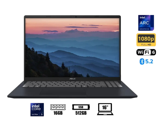 LAPTOP, ASUS VIVOBOOK X1607CA-MB058, CORE ULTRA 5 225H, RAM 16GB DDR5, SSD 512GB, PANTALLA 16 PULG WUXGA WV